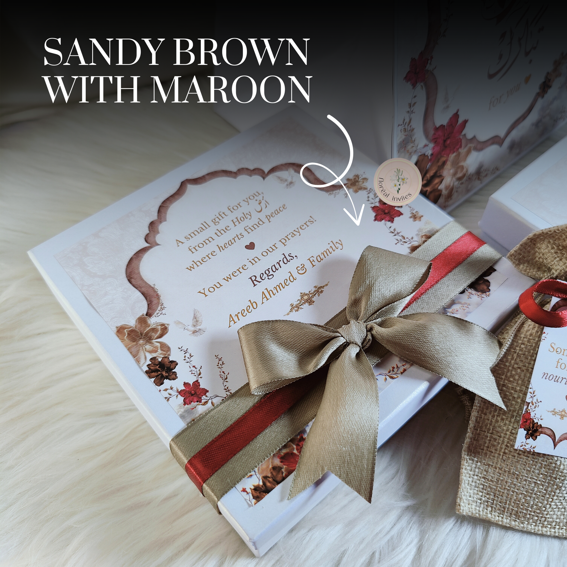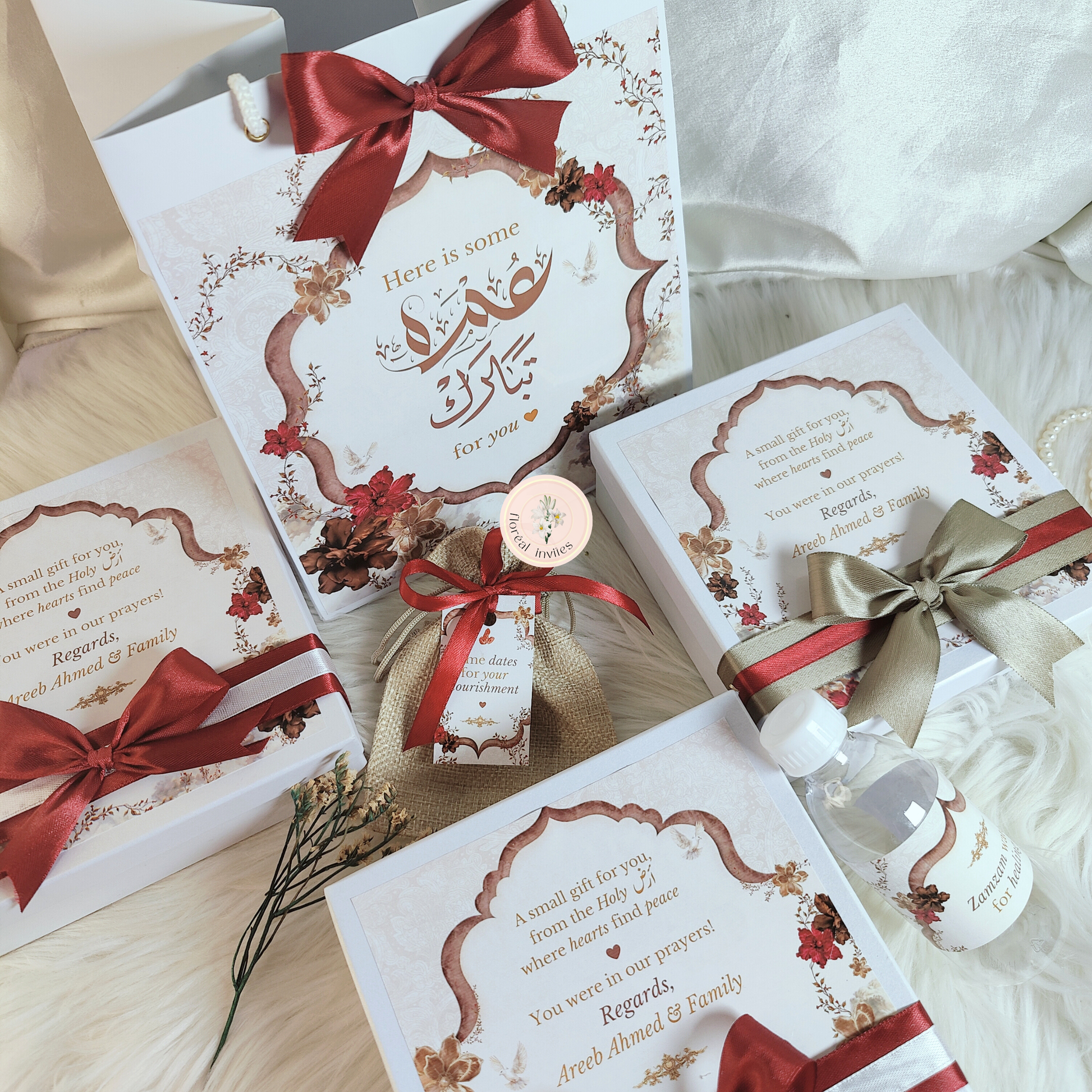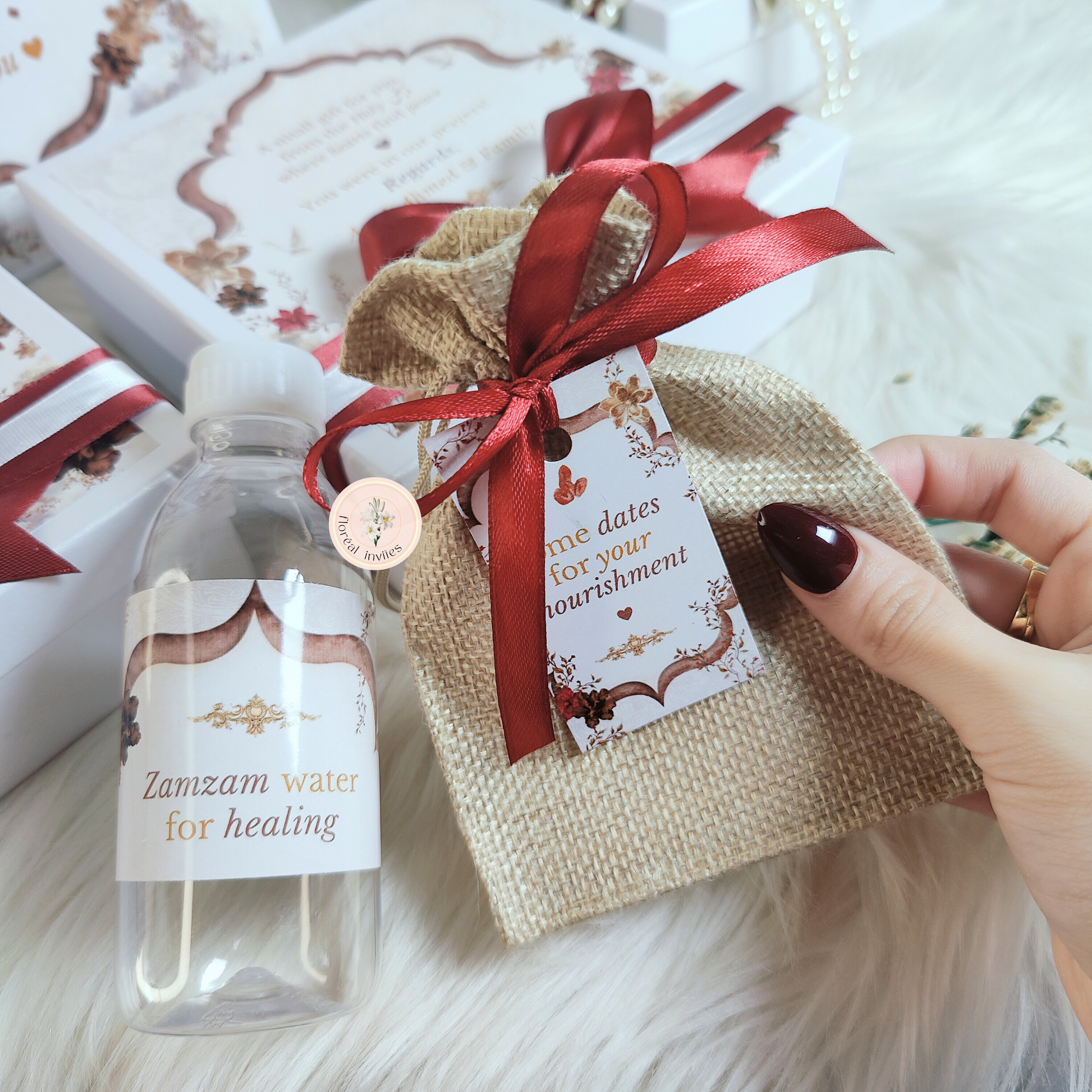 PLEASE NOTE: You will receive these boxes with bags, customized zam zam bottles, date pouches, tags (for the pouches) and ribbon. You will attach the date pouch tags with the provided ribbon at your end 🌷